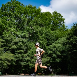 ランニングイベントの MC、PODCAST「ランラジ」パーソナリティとして人気の岡田拓海さん(タクミくん)。フルマラソンサブスリー、100 マイルトレイル完走とガチな実力の持ち主ながら、明るいキャラクターでランニングの楽しさを伝えている。タクミくんのランラジロゴをトライバルカモにアレンジ。背中をメッシュで切り替えたポケットTシャツ。