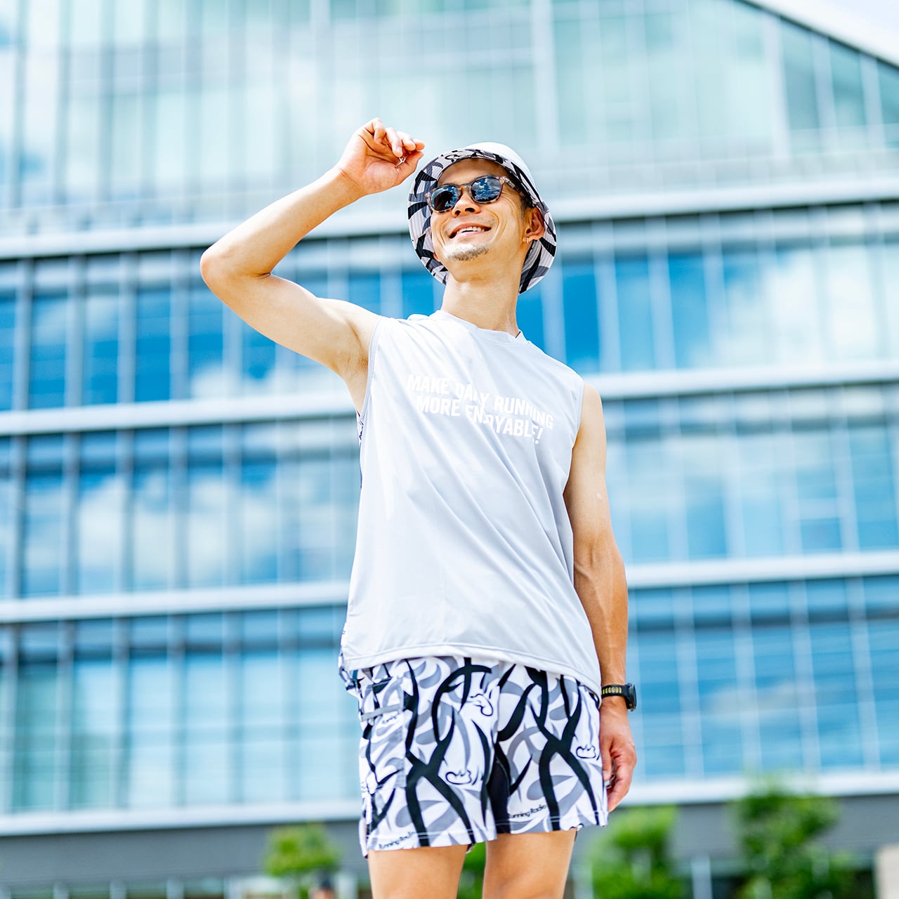 ランニングイベントの MC、PODCAST「ランラジ」パーソナリティとして人気の岡田拓海さん(タクミくん)。フルマラソンサブスリー、100 マイルトレイル完走とガチな実力の持ち主ながら、明るいキャラクターでランニングの楽しさを伝えている。タクミくんのランラジロゴをトライバルカモにアレンジ。ロード&トレイルランで活躍する7つのポケットを持つランニングショーツ。