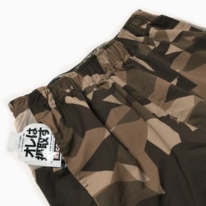 本体素材は、通風孔があり通気性の高い東レの機能素材Dot Air®︎を使用。吸水速乾と撥水加工に加えて薄く軽量で、長時間着用していてもストレスを感じにくい。足の稼働域を広げるガゼット部分はストレッチ性を持つDot Air®︎で切り返している。全面にオリジナルカモフラージュを昇華転写プリント。