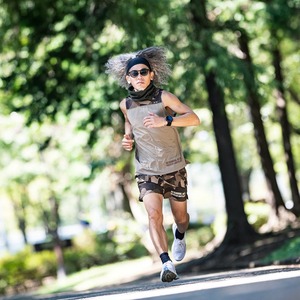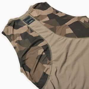 日本製のオリジナルボディは、胸部と背面の肩甲骨部をCOOLMAX®の速乾メッシュで切り替え、通気性を向上。オリジナルカモフラージュを昇華転写プリントしている。肩甲骨に沿った切り替えは腕振りを遮ることなく、ランニング時の肩周りの動きをスムースに。
