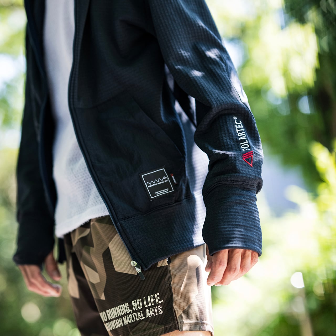 寒い時期のロード&トレイルランニング、ハイクと幅広いシーンで高い機能を発揮する高機能素材「POLARTEC® Power Grid」を使用したフロント全開+両脇ベンチレーション装備のフーディー。