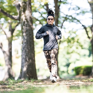 本体素材は、2 種類の東レ Primeflex ®を使用。風の当たる前面は撥水、2way ストレッチの軽量素材。背面はよりしなやかな吸水速乾ストレッチ素材で。前面にオリジナルカモフラージュを昇華転写プリント。