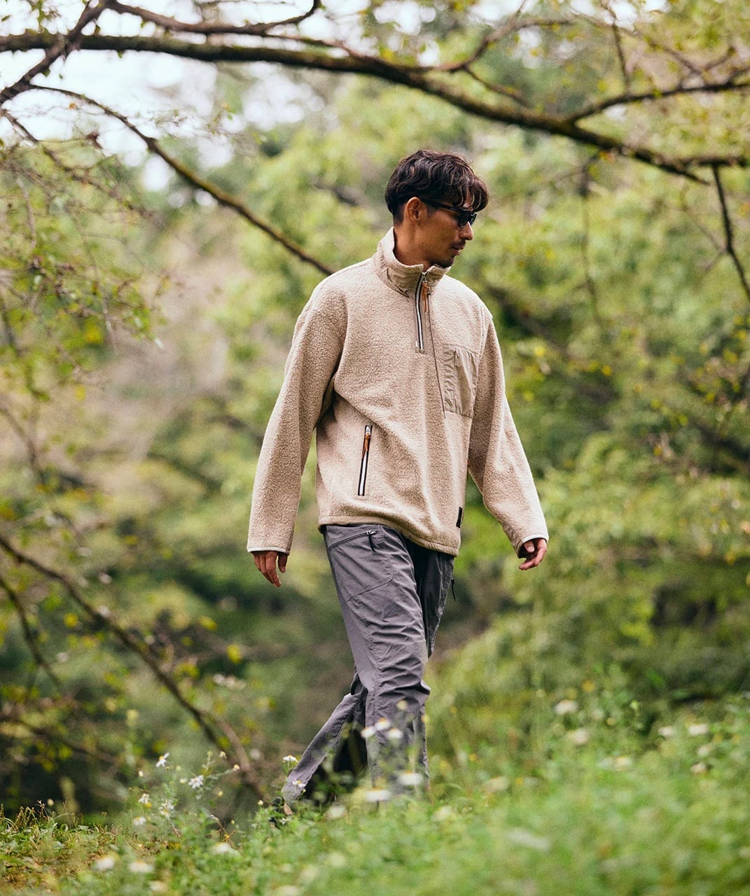 本体素材は、リサイクルナイロンをタマネギの廃棄物を含む様々な植物の天然成分から染色した小松マテーレの環境配慮素材「Onibegie®」を使用。リサイクルが難しいナイロンを100%再生。ナイロンの持つ高い耐久性と速乾性はそのままに、天然色素から生まれるやわらかい色合いが特徴的。撥水加工を施し、軽量な履き心地はアクティビティにも対応する。