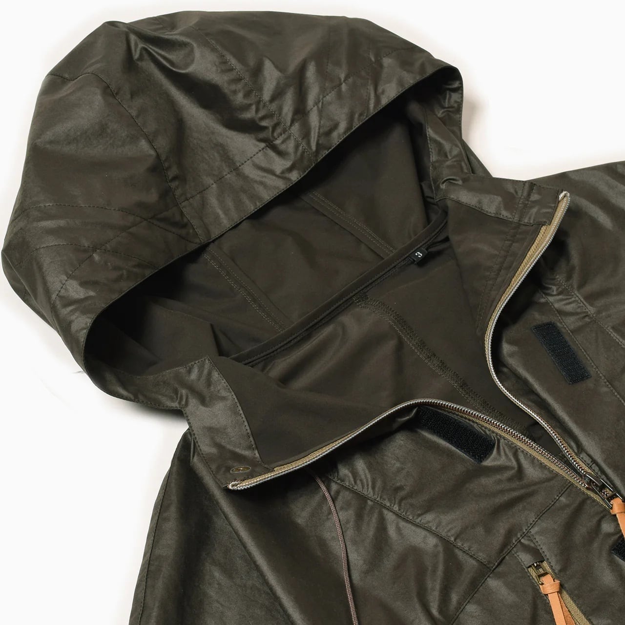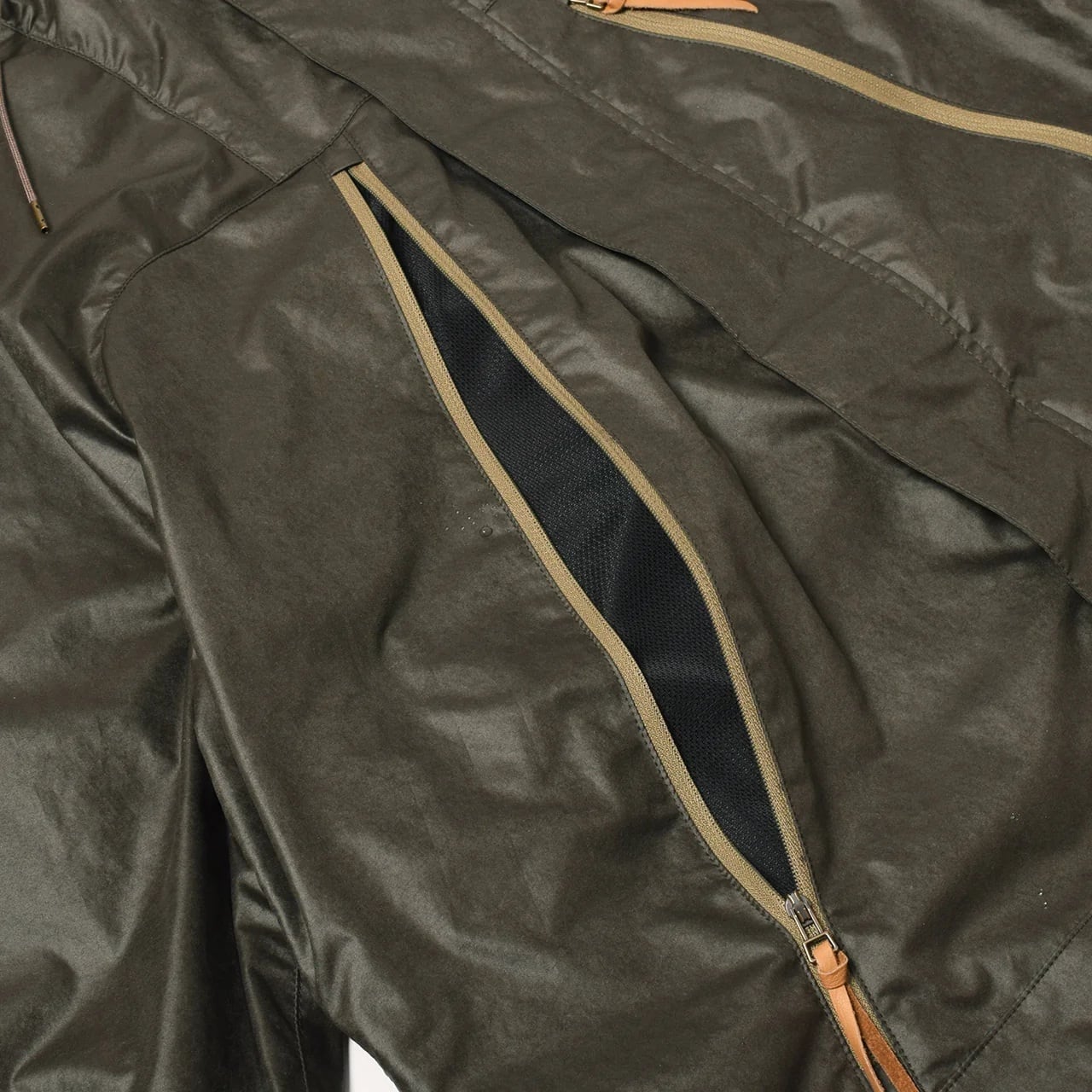 ヴィンテージ感のある光沢がワックスドコットンに見える素材は「小松マテーレ」による形状保持加工と撥水加工を施した軽量機能素材。重量感のあるビジュアルに反して軽量な着心地で、大きなベンチレーションを備えたウィンドシェル。