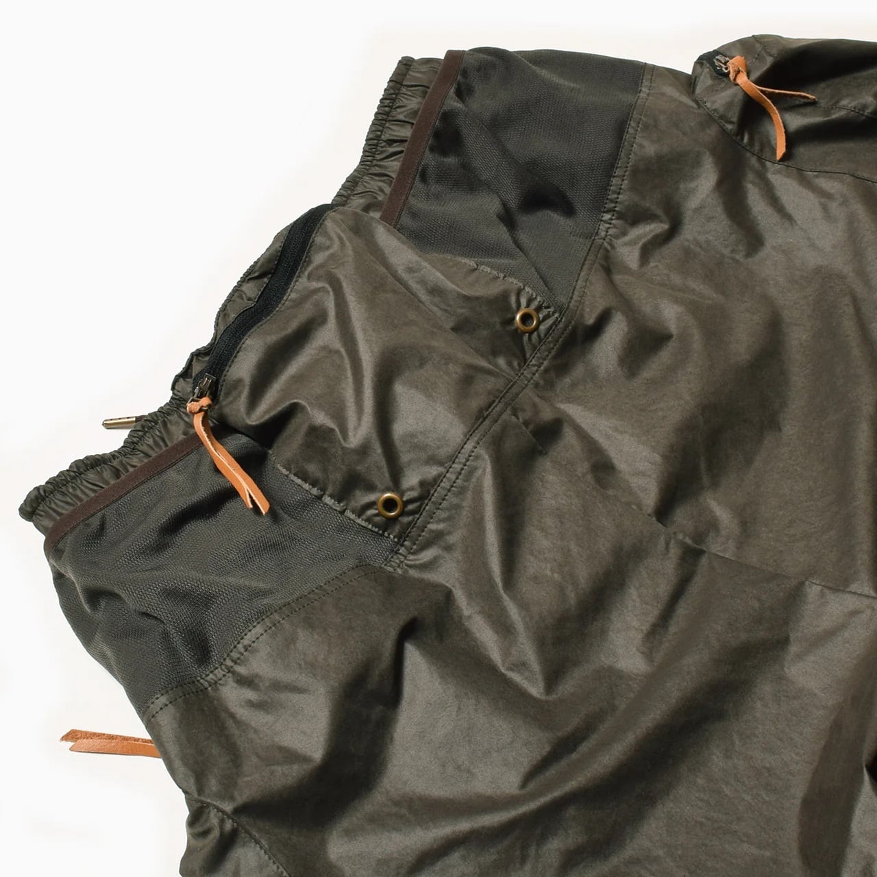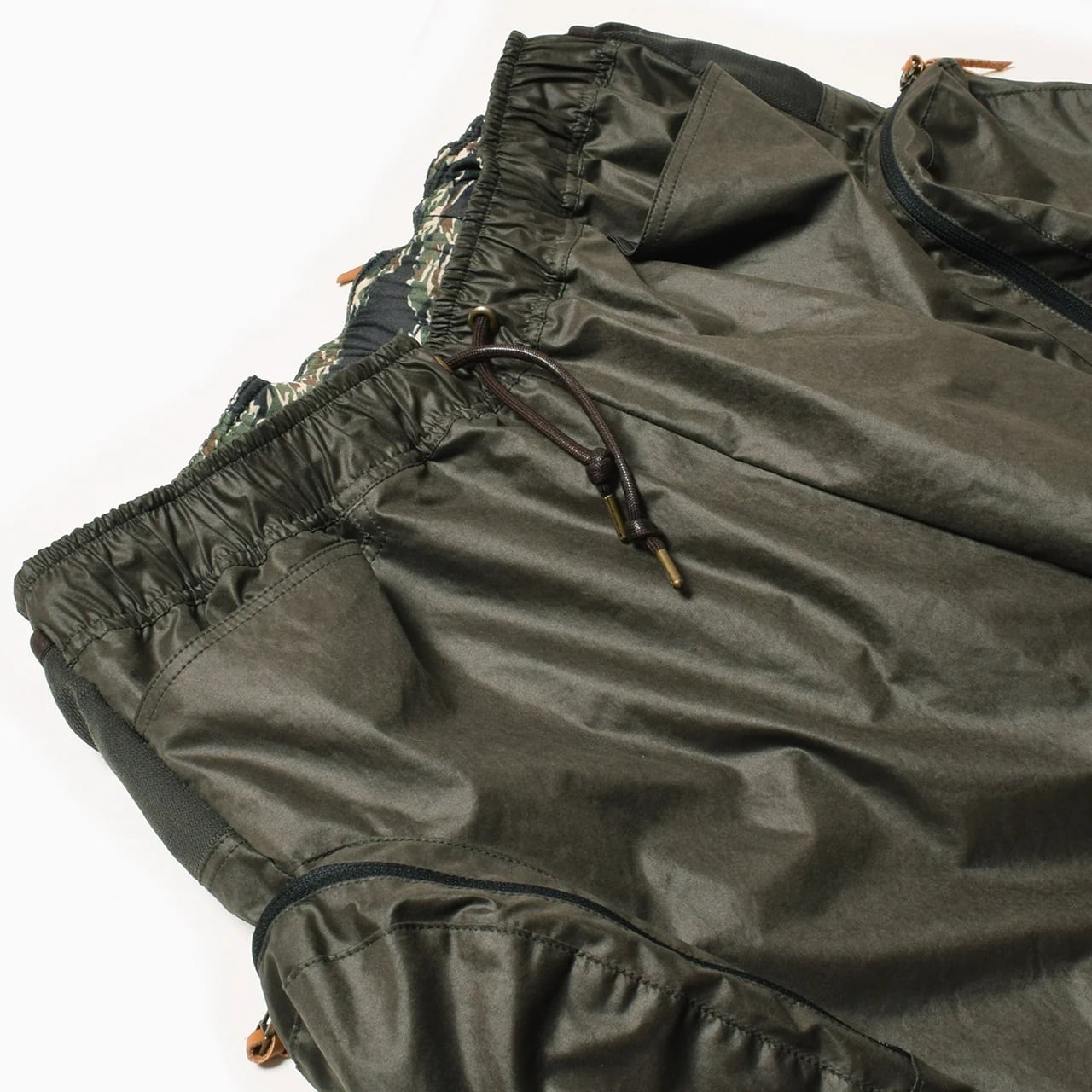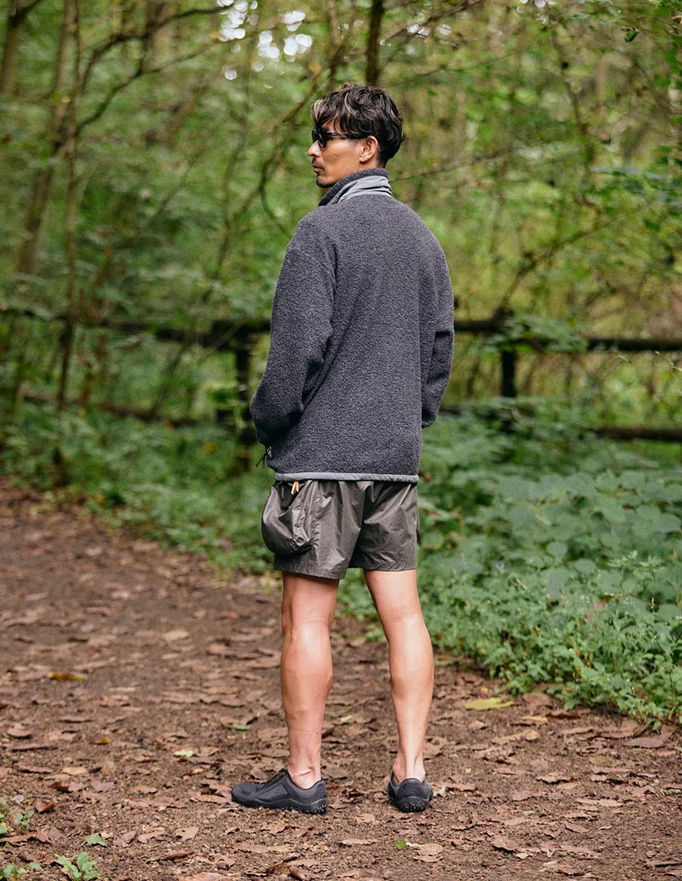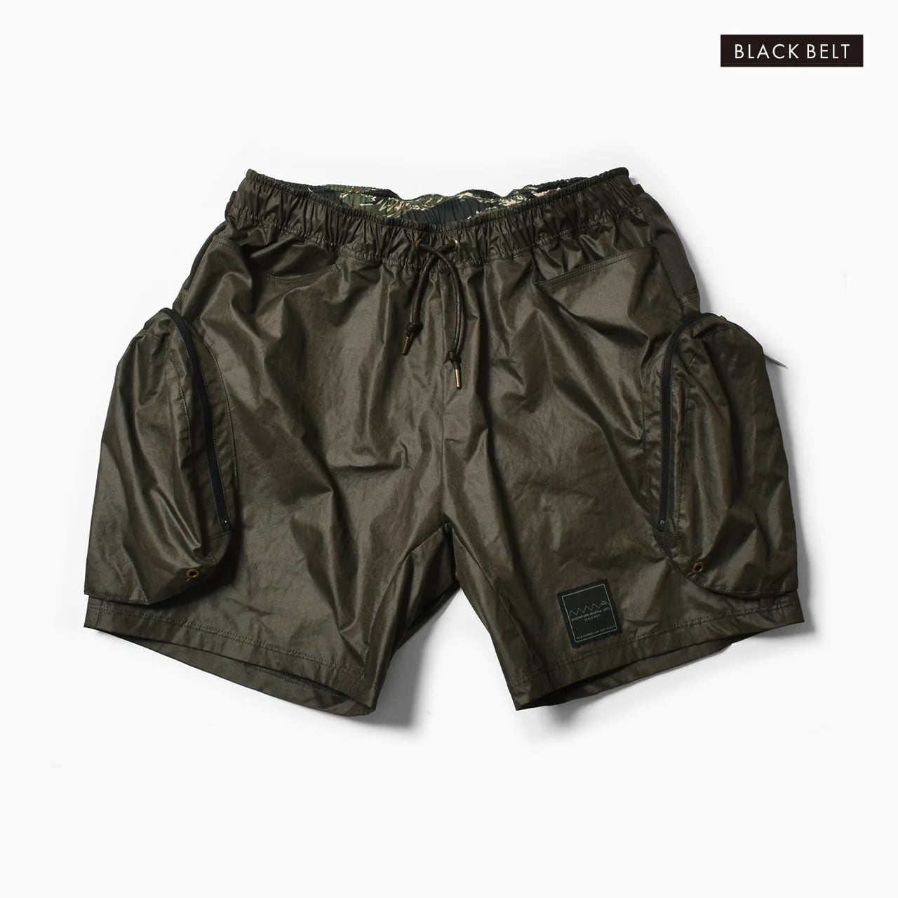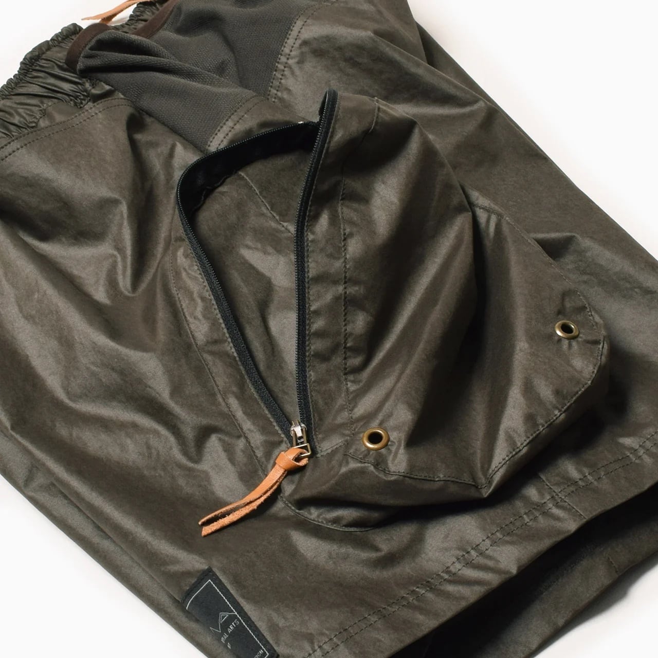 ヴィンテージ感のある光沢がワックスドコットンに見える素材は「小松マテーレ」による形状保持加工と撥水加工を施した軽量機能素材。重量感のあるビジュアルに反して軽量な履き心地の7つのポケットを装備したラン&ハイクショーツ。