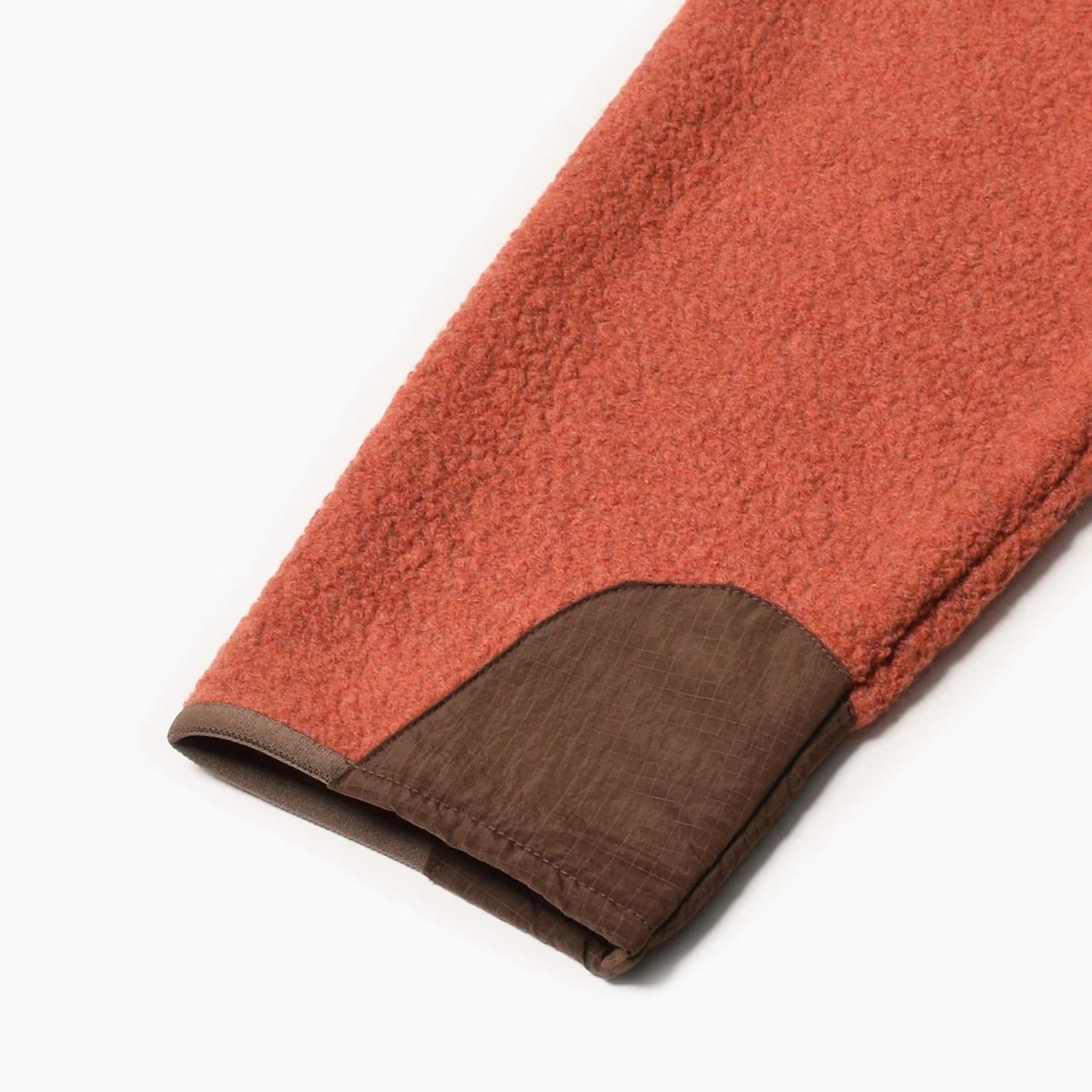 本体素材は、CALAMAI社の再生ウールとマイクロ化繊糸を混紡したエアリーなウールフリースを使用。イタリアならではの発色の良さとソフトな肌触りで、ボリューミーに見えながらも軽量で快適な着心地。ウールの持つ「保温性」「防臭性」に優れ、アクティビティにも対応するウォッシャブル仕様。