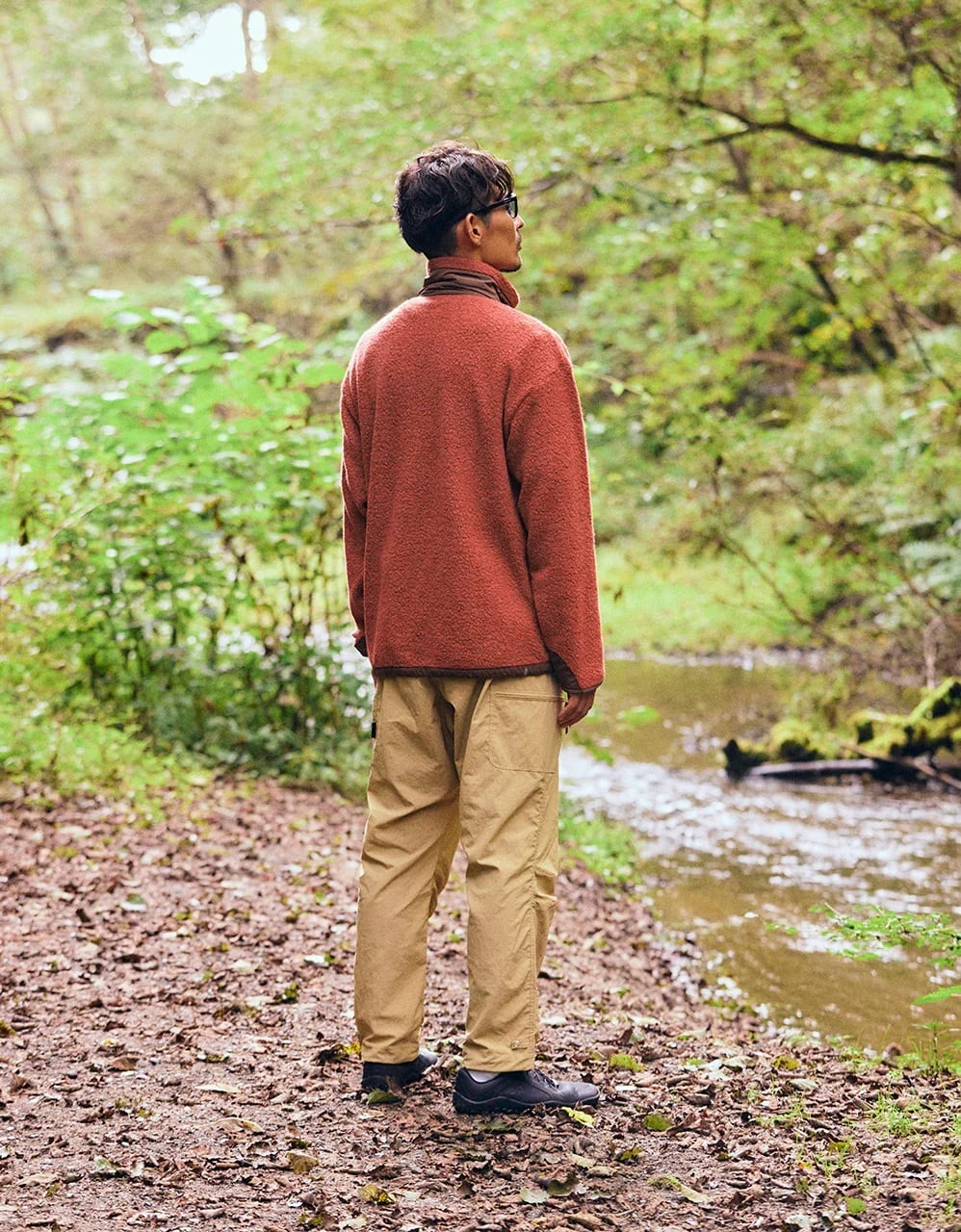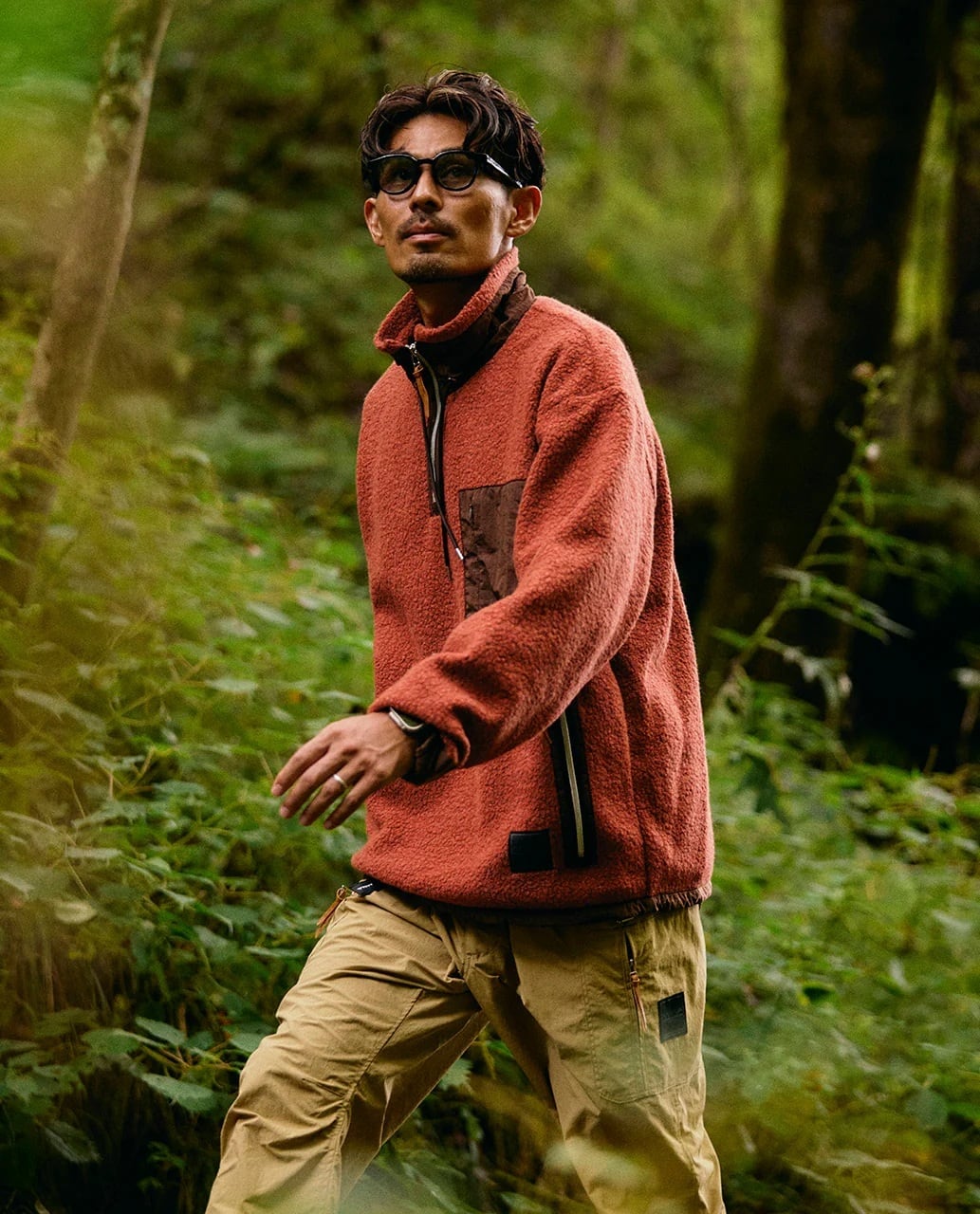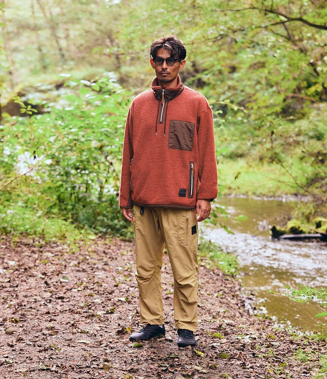 日本製のオリジナルボディは、肩幅と身幅にゆとりを持たせたリラックスシルエット。胸元のハーフファスナーで体温調節が可能。ファスナーは軽量で高級感のあるメタリックコイルファスナーを使用。襟とポケットカバーと袖先には高強度の撥水モノフィラメントリップストップナイロンを使用することで高い耐久性を持つ。