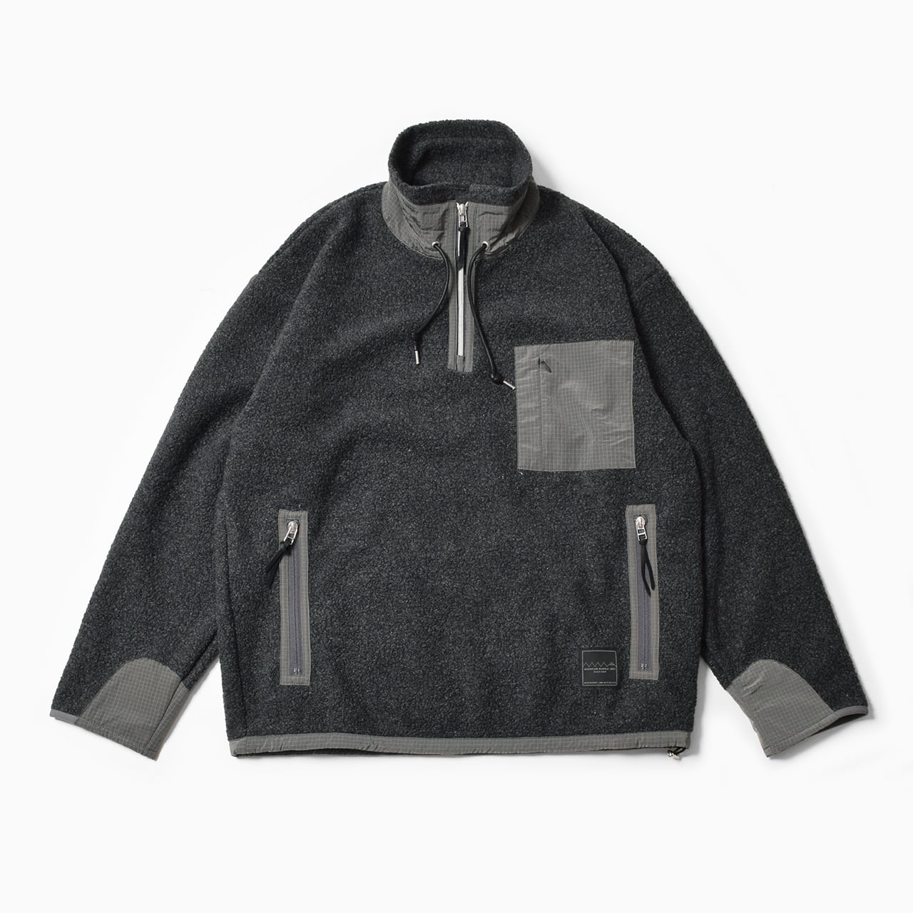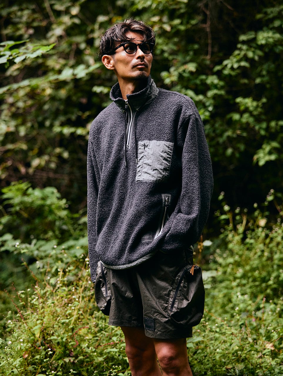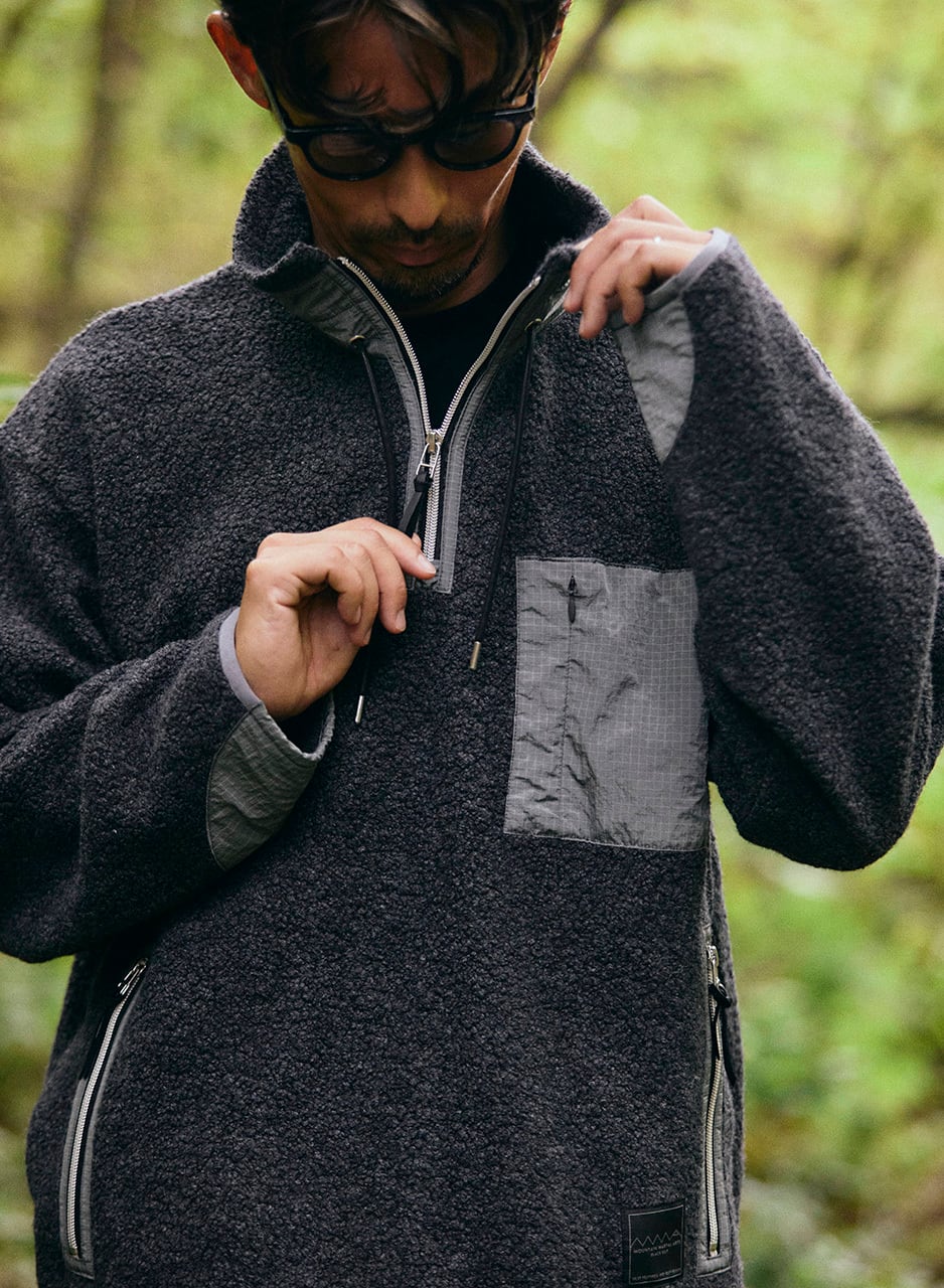 日本製のオリジナルボディは、肩幅と身幅にゆとりを持たせたリラックスシルエット。胸元のハーフファスナーで体温調節が可能。ファスナーは軽量で高級感のあるメタリックコイルファスナーを使用。襟とポケットカバーと袖先には高強度の撥水モノフィラメントリップストップナイロンを使用することで高い耐久性を持つ。