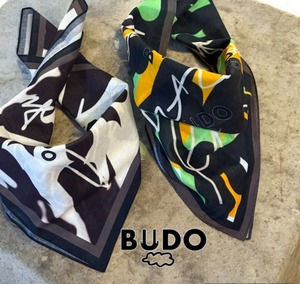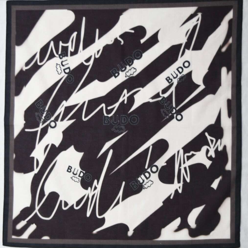 このバンダナはフリーハンド&不規則に構成され、折り方によってはBUDOのロゴが現れたり、現れなかったりします。