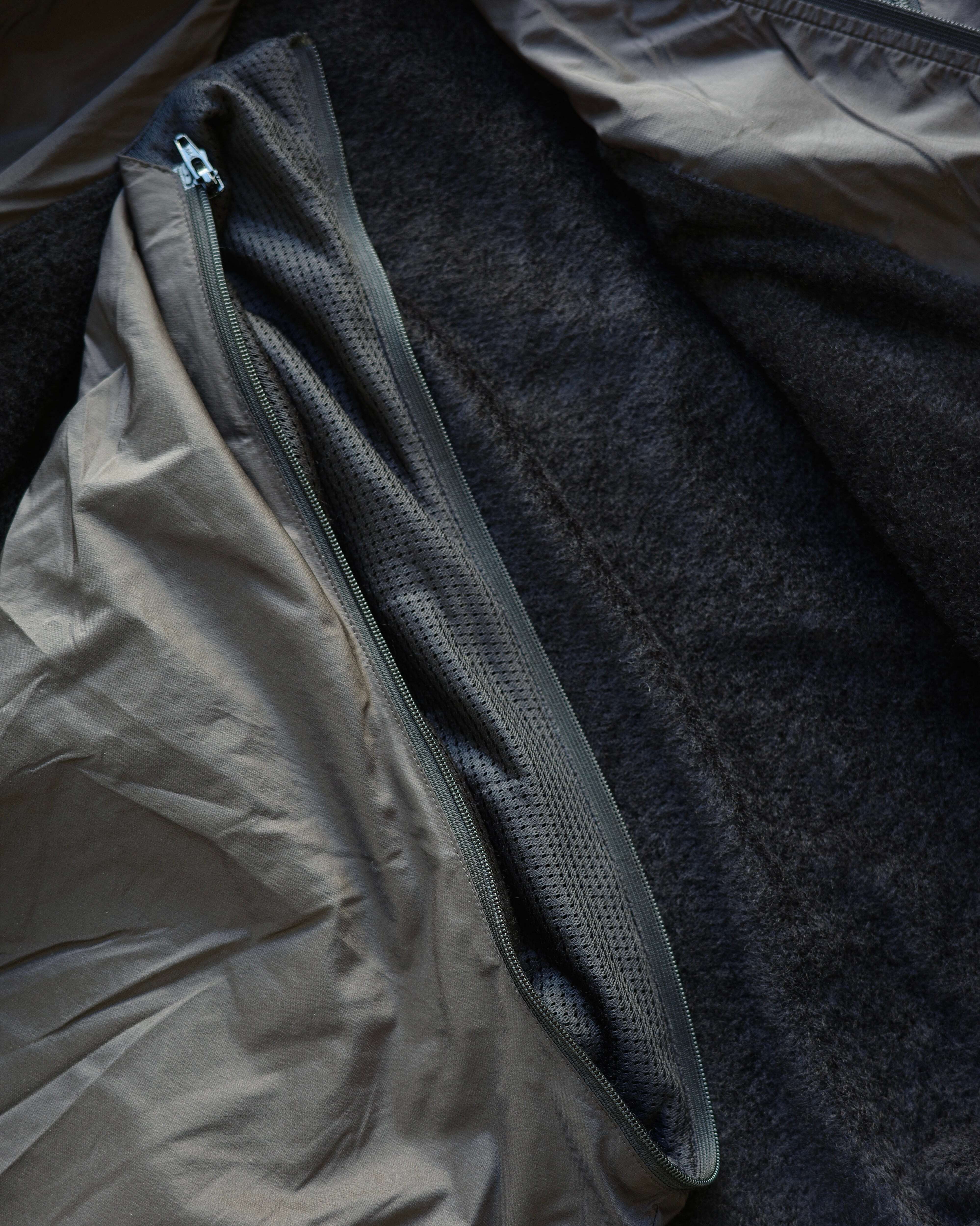身頃には包み込むような暖かさのある起毛面を、袖には滑りを良くするためフラット面を、とOctaの特徴を理解した上での表裏使いをしている。