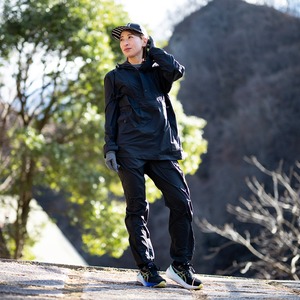 日本製のオリジナルボディは、オーバーパンツとして使えるゆとりのあるナチュラルシルエット。必要最低限な4つのポケットを備え、背部腰部のファスナー付きポケットに収納することでパッカブルになる。裾はドットボタンで開閉し、シューズを履いたままでも着用可能。ウエストはゴム+紐、裾はドローコードでフィット感を調整できる。