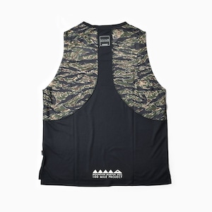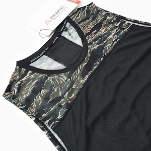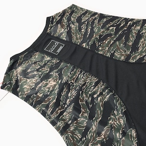 日本製のオリジナルボディは、胸部と背面の肩甲骨部をCOOLMAX®の速乾メッシュで切り替え、通気性を向上。肩甲骨に沿った切り替えは肩周りの動きをスムースに。メッシュにはタイガーカモを昇華転写プリント。