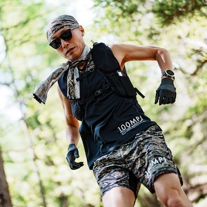 実績のあるプロダクトを100マイル向けにアジャスト。トップスはハイパフォーマンスランナー向けに開発したスリーブレスをベースに、長時間の着用でもストレスを感じないように肩幅と身幅を調整し、締め付け感のないサイジングに。