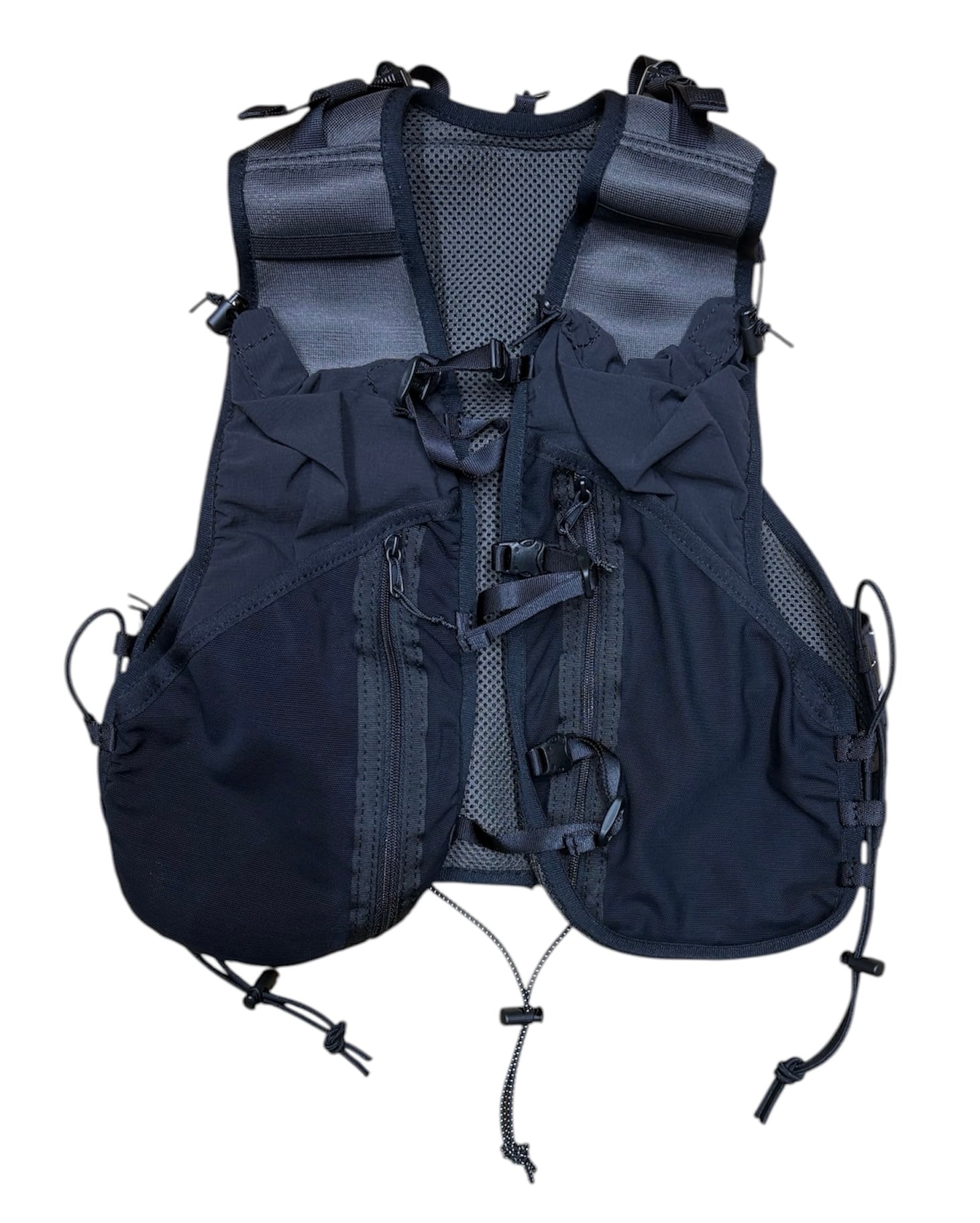本体サイド部分のドローコードで、側面にストックポールやボトルを収納・固定可能。ドローコードを締めることにより本体の厚みを調節できる。空身で締めれば厚みのないベストのようなフィット感に。