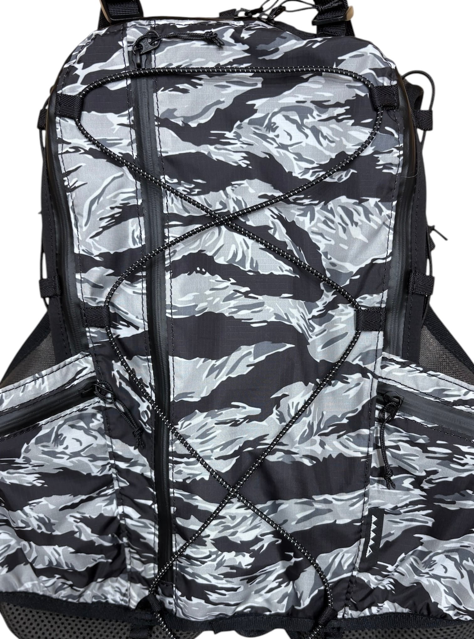 本体表面は撥水加工を施した軽量リップストップにタイガーカモを昇華転写プリント。本体サイド部分(マチ)はストレッチ素材を使用。ハーネスを含むベースには、ハニカム構造で通気性と速乾性に優れたダブルラッセルを使用。二重構造の弾力で身体への負担を軽減する。