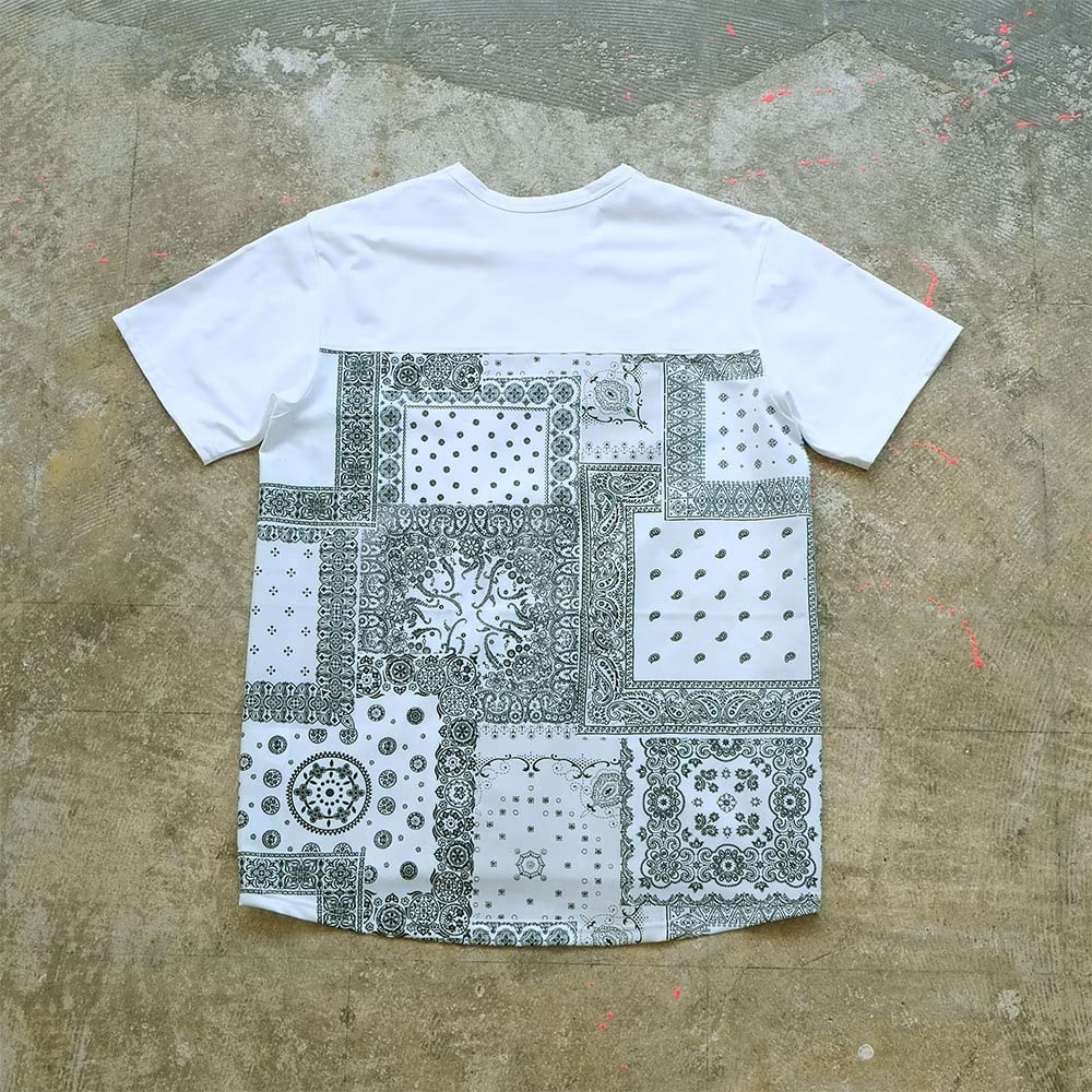 数種類のビンテージバンダナのエイジングを生かしパッチワークをデータ化プリント致しましたバンダナTシャツです。