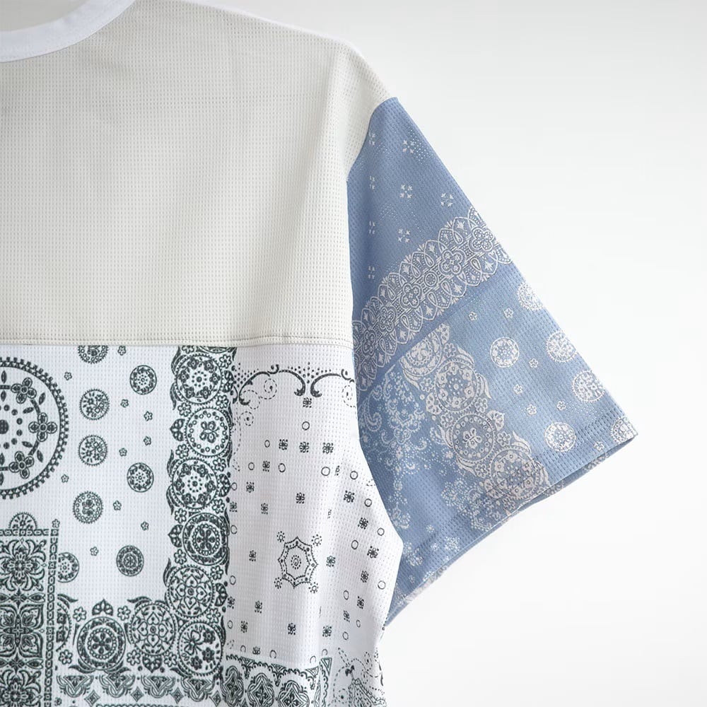 数種類のビンテージバンダナのエイジングを生かしパッチワークをデータ化プリント致しましたバンダナクレイジーTシャツです。