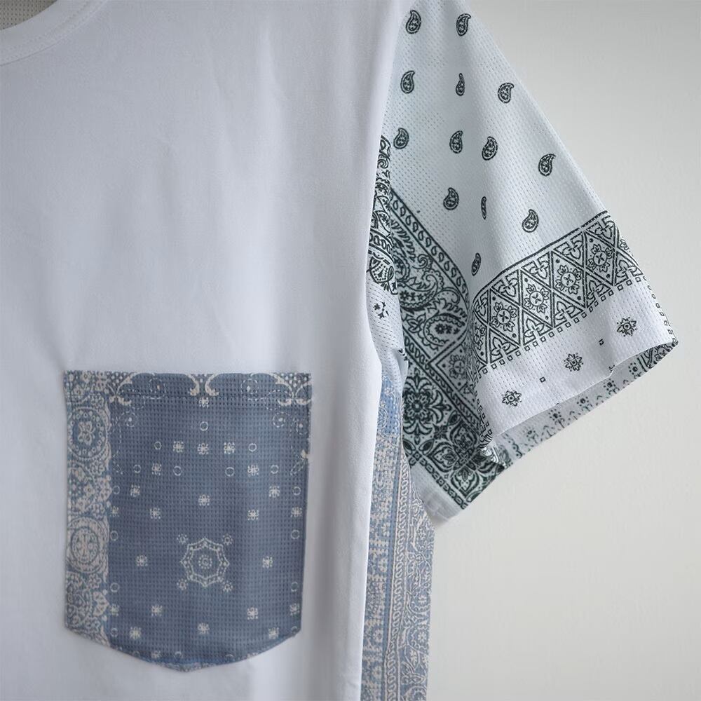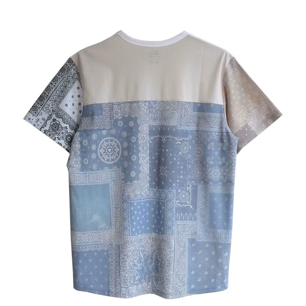 数種類のビンテージバンダナのエイジングを生かしパッチワークをデータ化プリント致しましたバンダナクレイジーTシャツです。